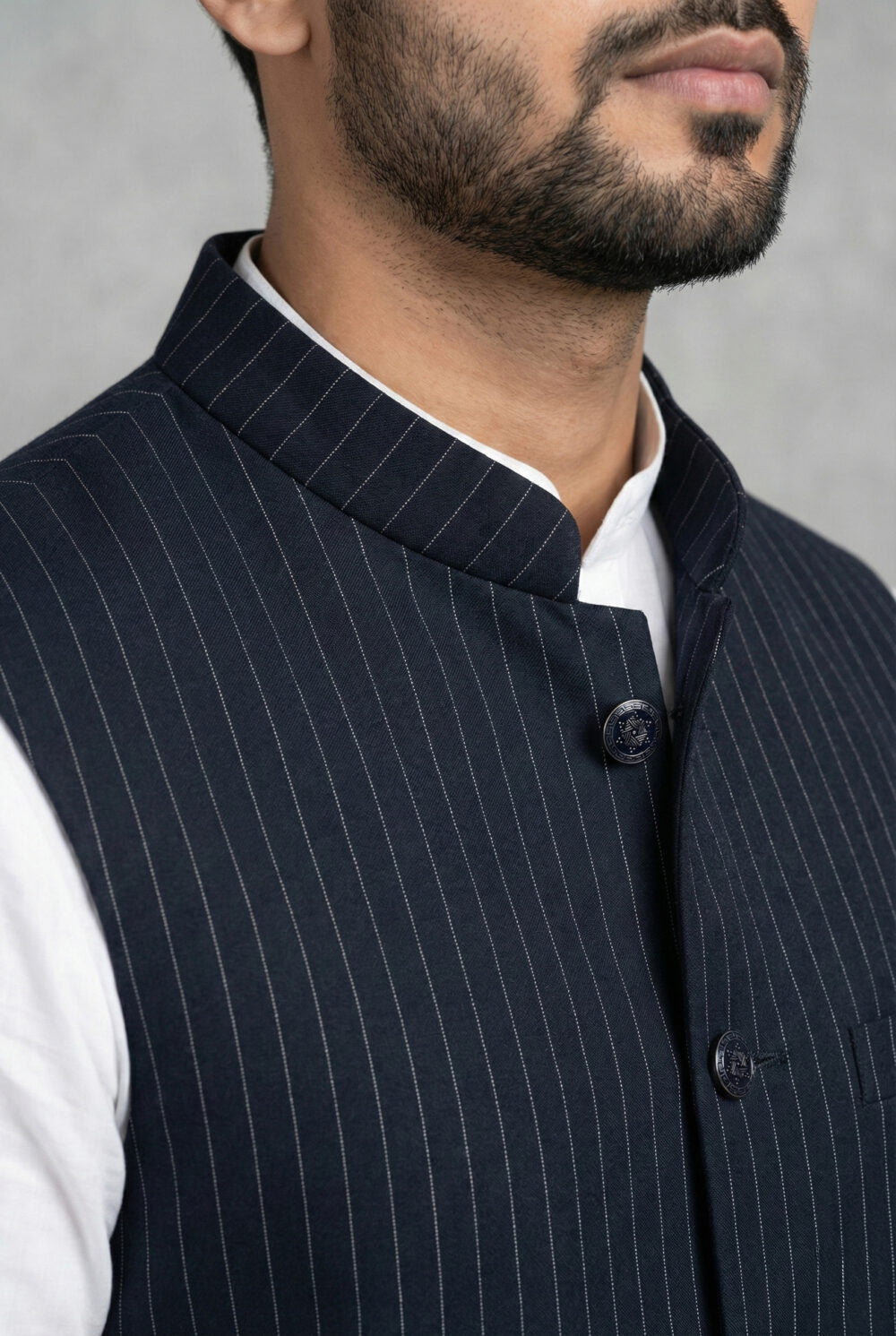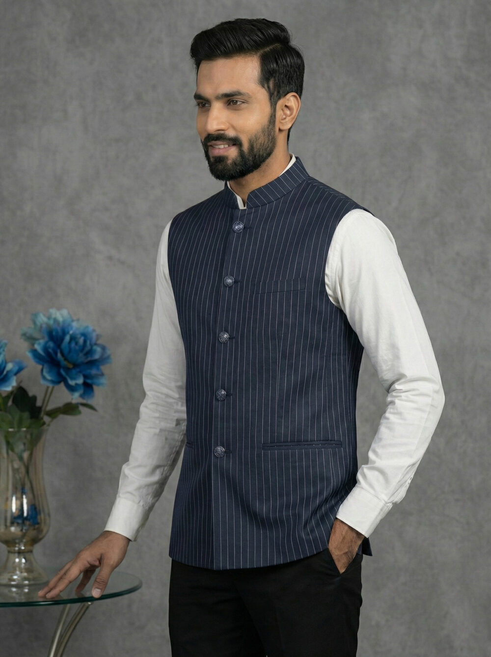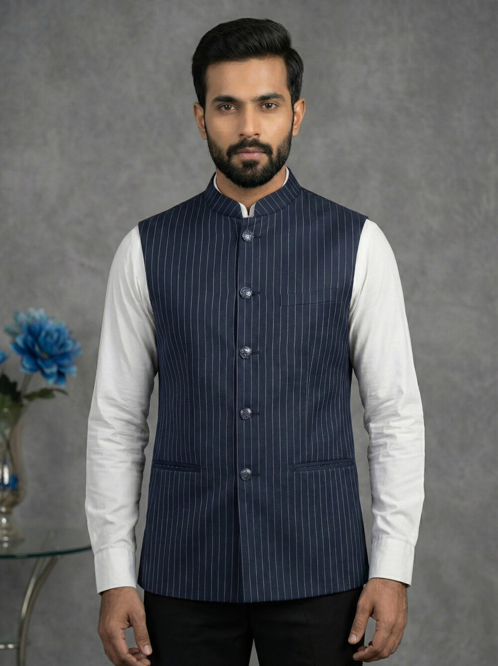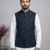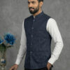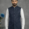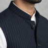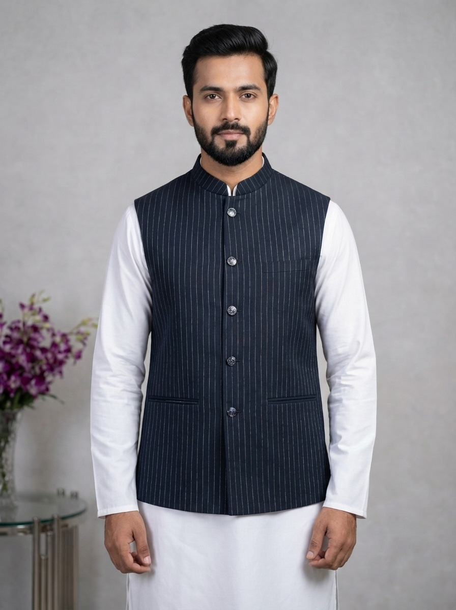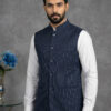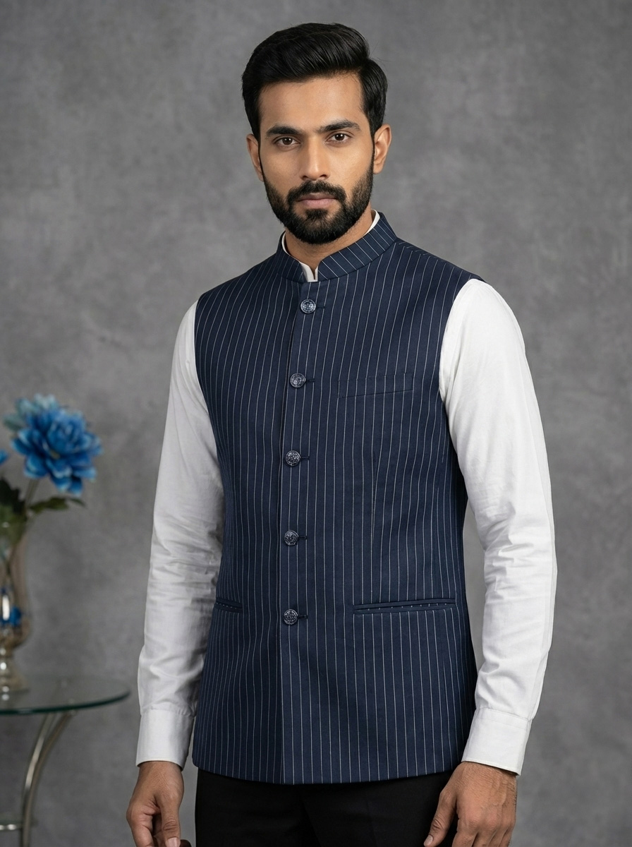 Crafted from premium Lycra fabric, this jacket offers a unique advantage: gentle stretchability that ensures ease of movement without compromising the tailored silhouette. The distinct blue color with white stripes adds a modern edge, distinguishing it from plain ethnic wear. Whether styled as a classic Modi coat for men over a kurta or as a sharp layer over a formal shirt, it is sure to turn heads.