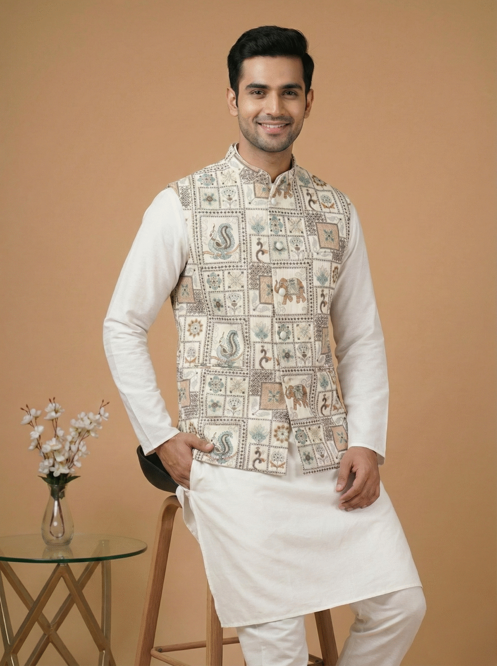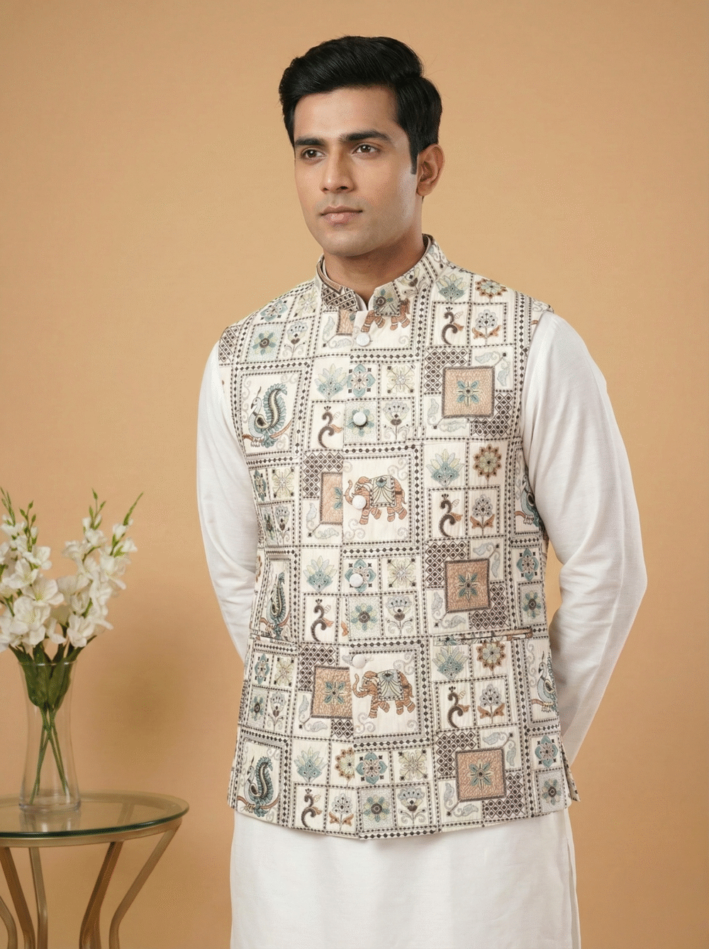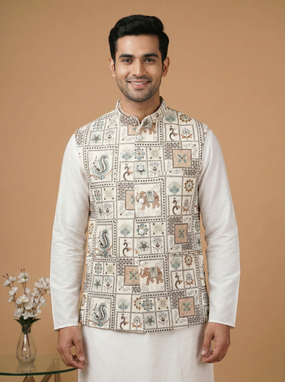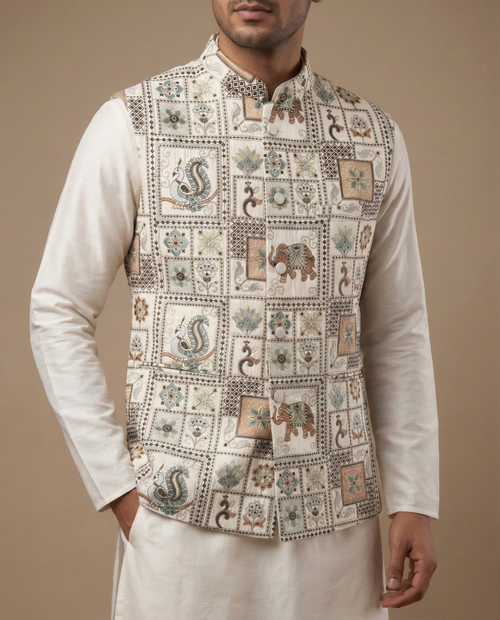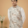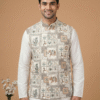 Designed for a premium look and feel, it is constructed with all-over fusing to ensure a stiff, structured silhouette that stays crisp all day. The waistcoat includes four functioning pockets (three outside, one inside) for convenience and is finished with a smooth satin lining for superior comfort. Pair it with a contrasting kurta pyjama set to complete your royal ethnic look.