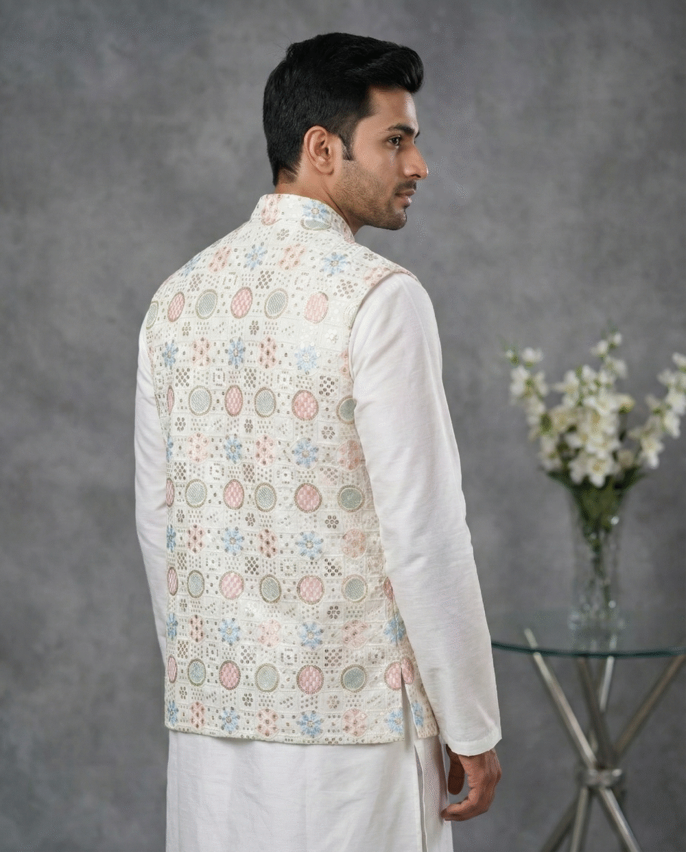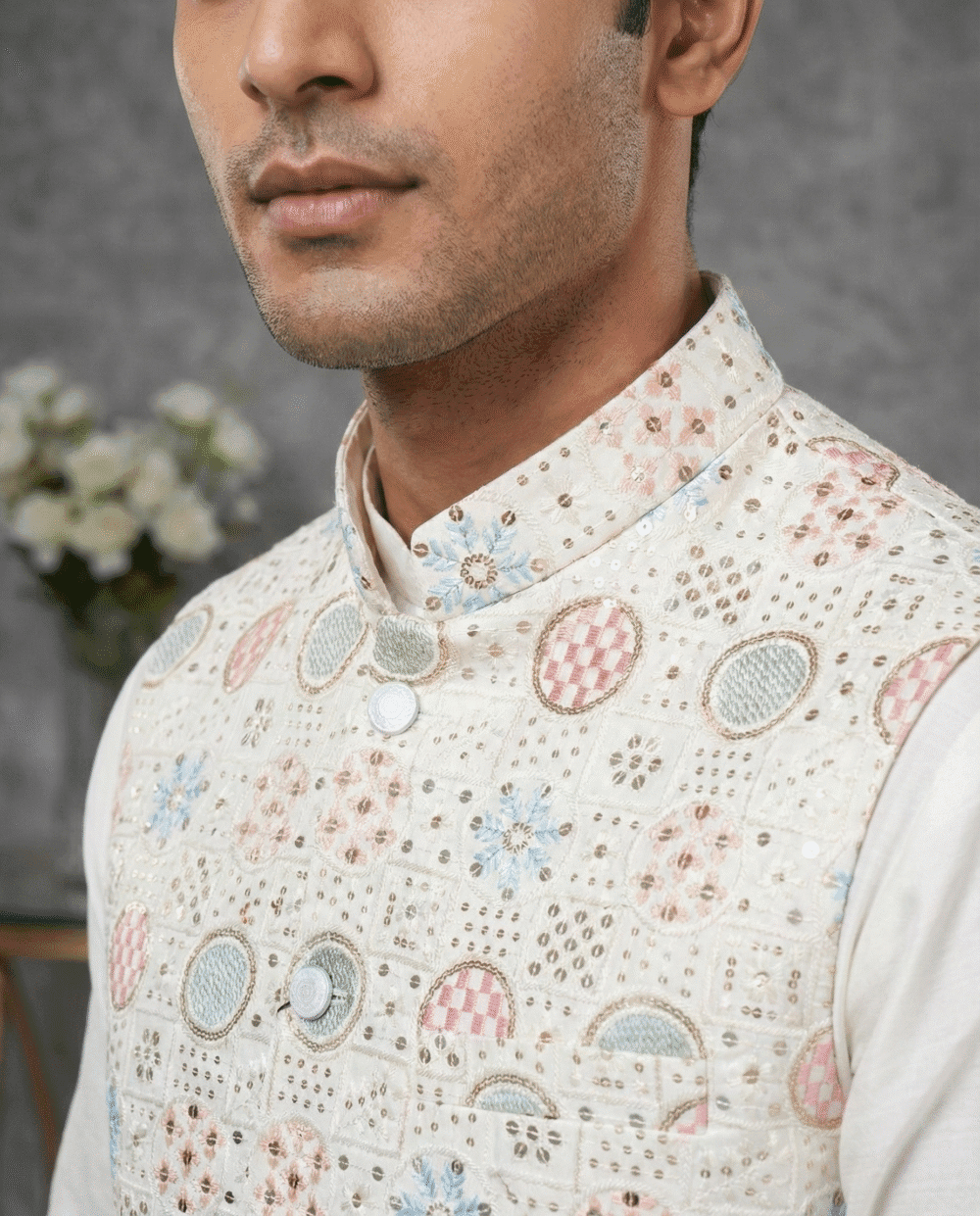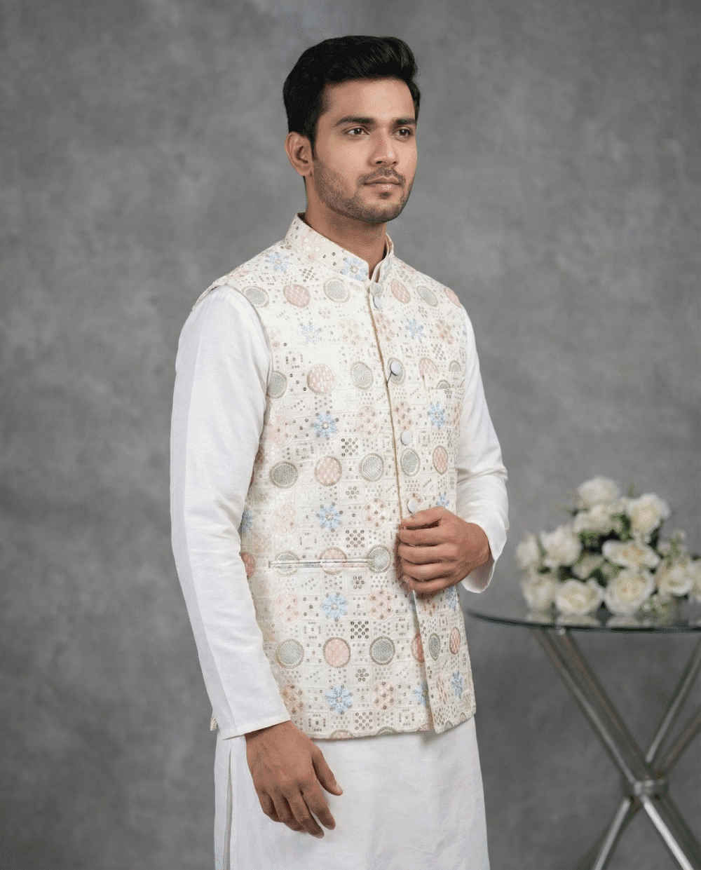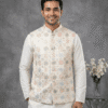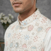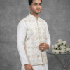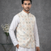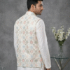 Step into elegance with this White Embroidered Waistcoat from Its Moment. Crafted from premium Malai Satin, this Nehru jacket features exquisite all-over embroidery, making it a luxurious choice for weddings, receptions, and high-end parties.