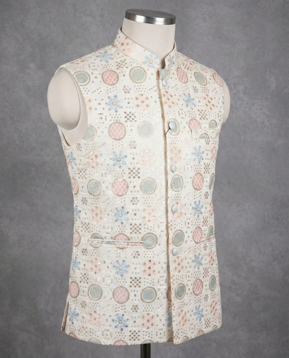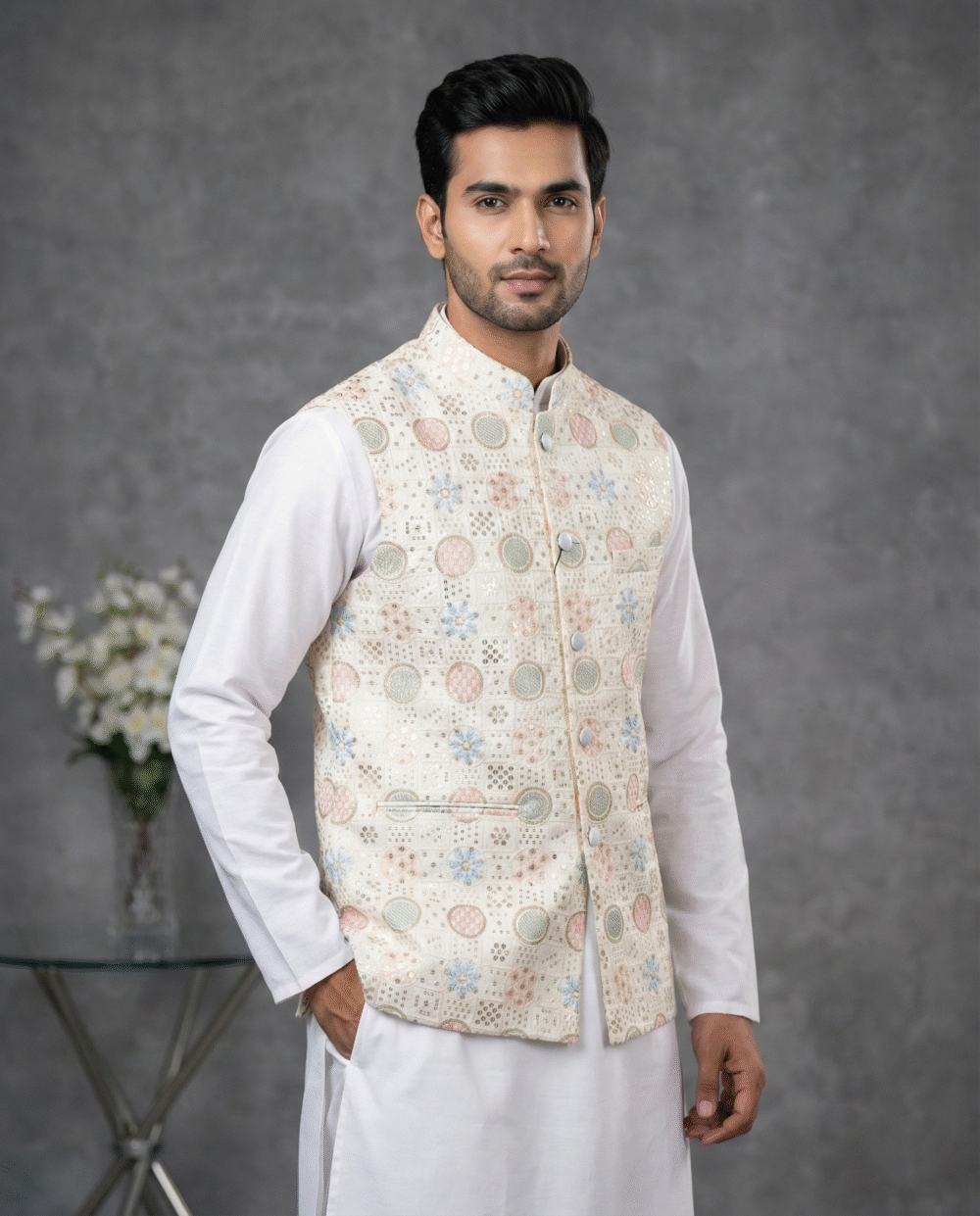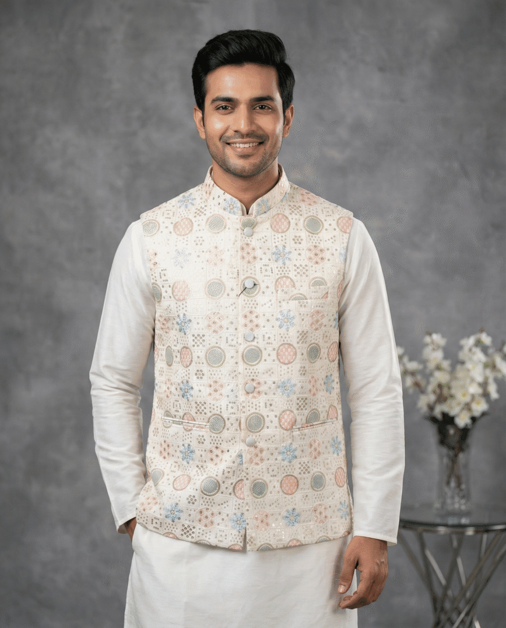 The jacket is designed with all-over fusing to maintain a sharp, wrinkle-free silhouette that looks polished throughout the event. It offers practical utility with four functioning pockets (three outside, one inside) and is finished with a smooth satin lining for superior comfort. Pair this designer Nehru jacket with a matching kurta set to create a stunning, royal ensemble.
