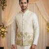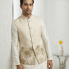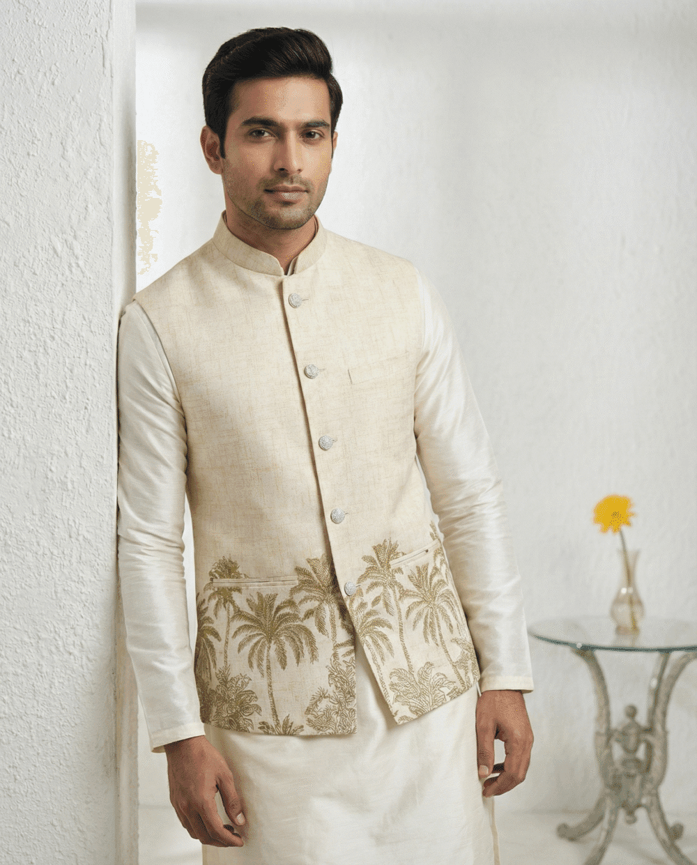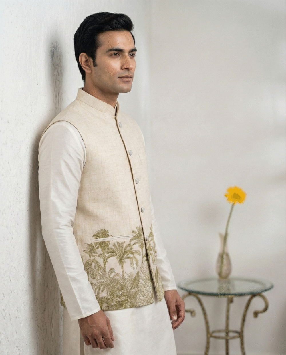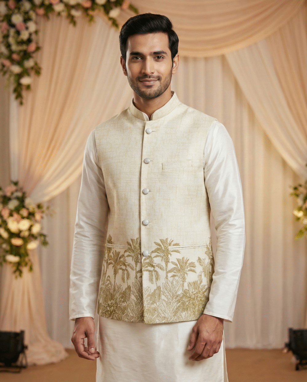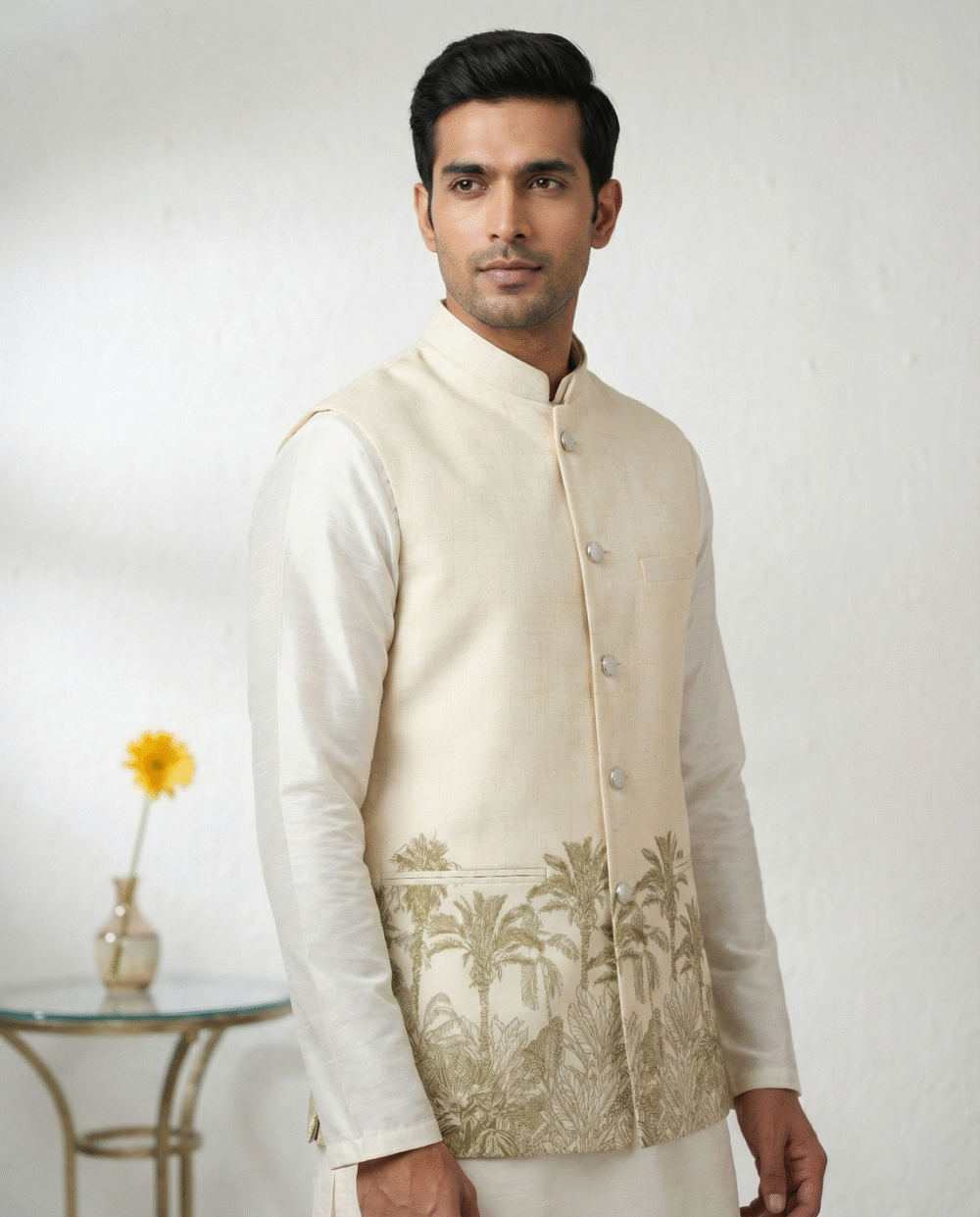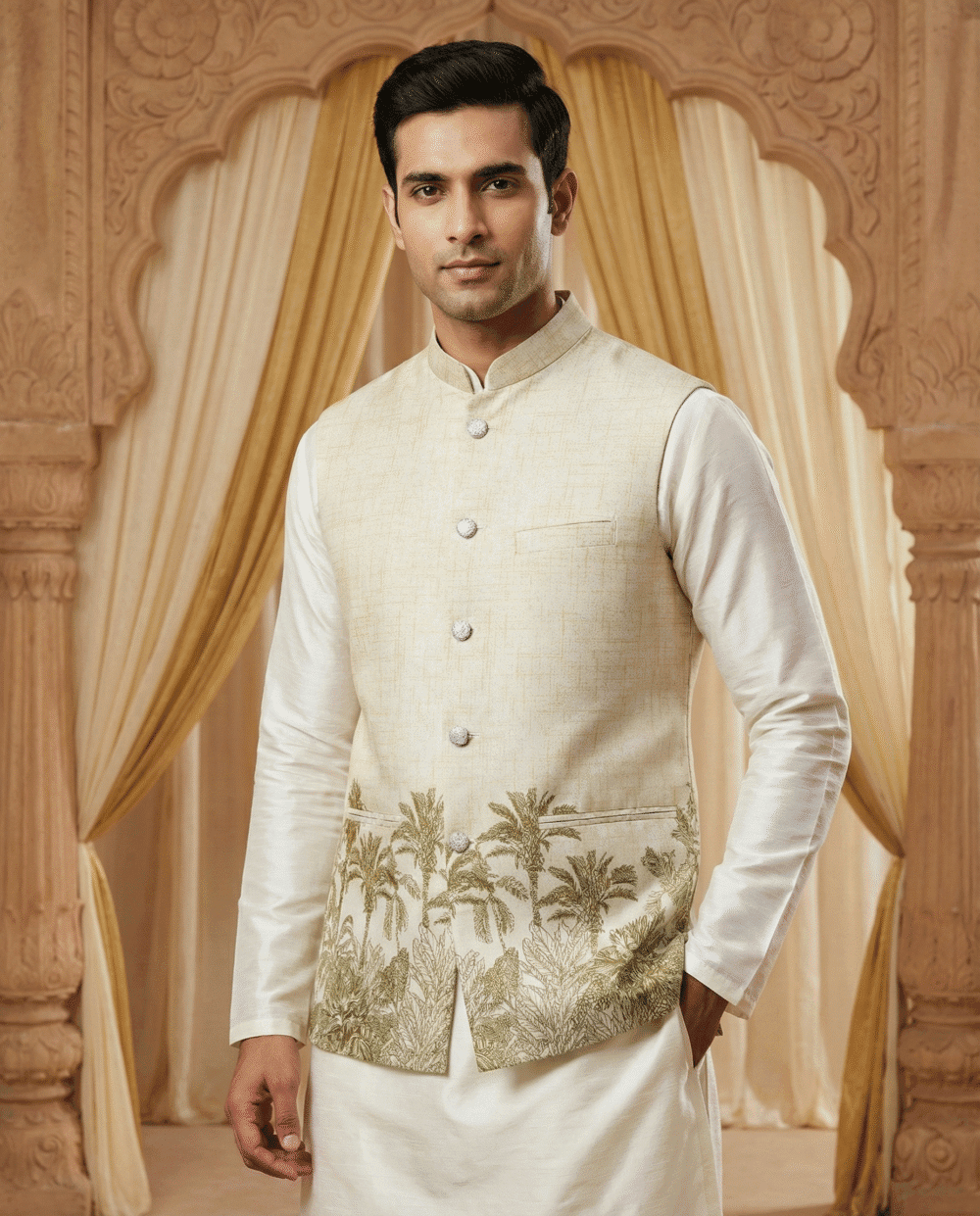 The highlight of this piece is the artistic coconut/palm tree print along the hemline, offering a unique blend of modern resort wear and traditional style. Despite its relaxed look, the jacket is constructed with all-over fusing to maintain a sharp, wrinkle-free silhouette. It features four functioning pockets (three outer, one inner) for convenience and a smooth satin lining for all-day comfort. Pair it with a white kurta or linen trousers for a standout look at beach weddings, Haldi ceremonies, or casual gatherings.