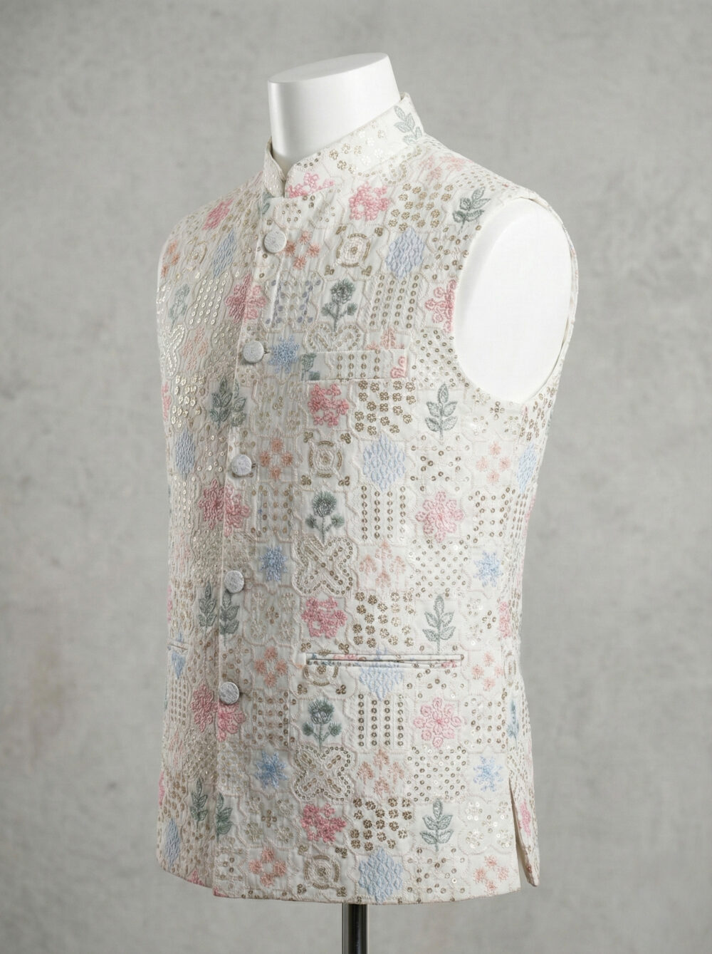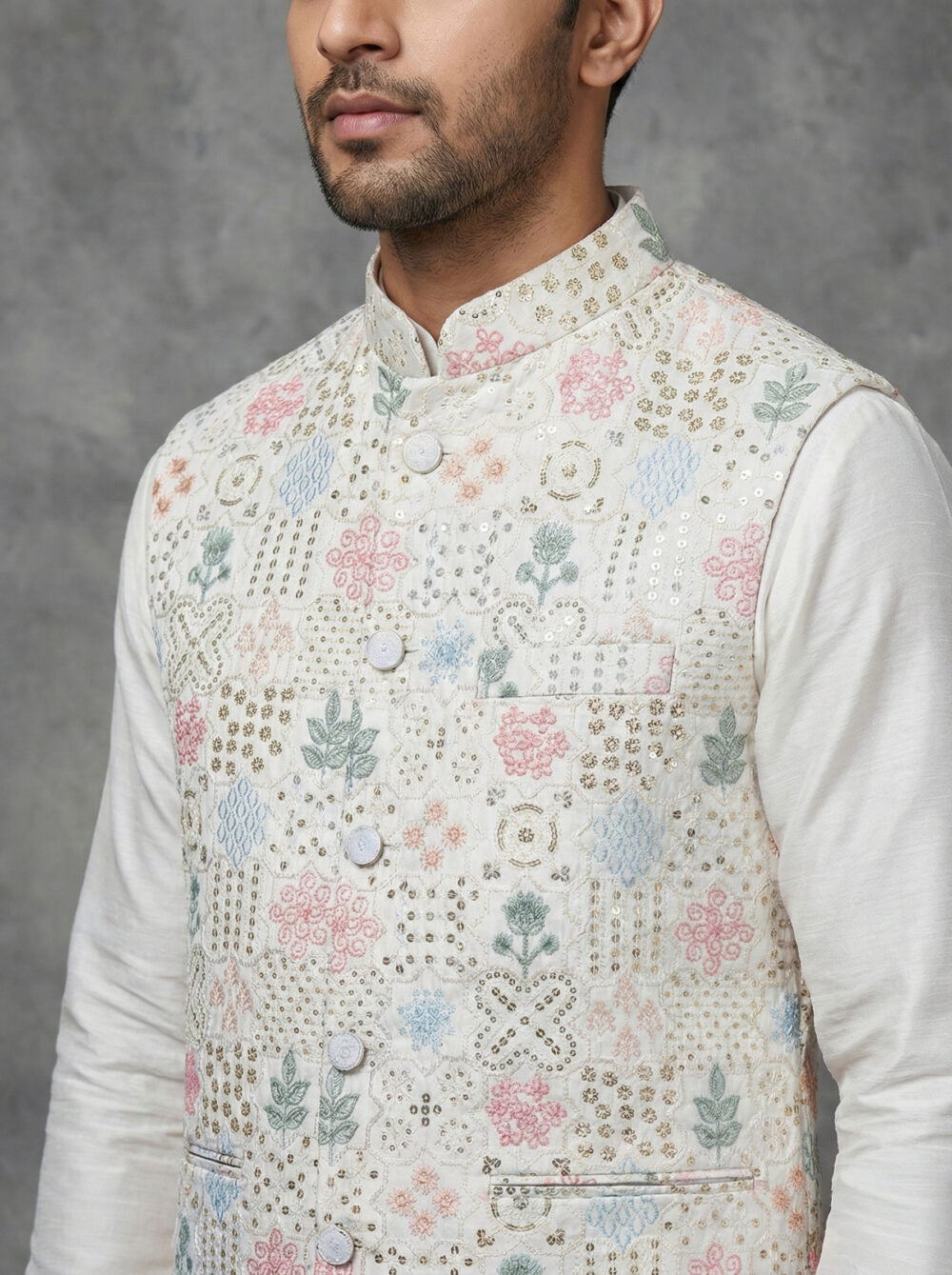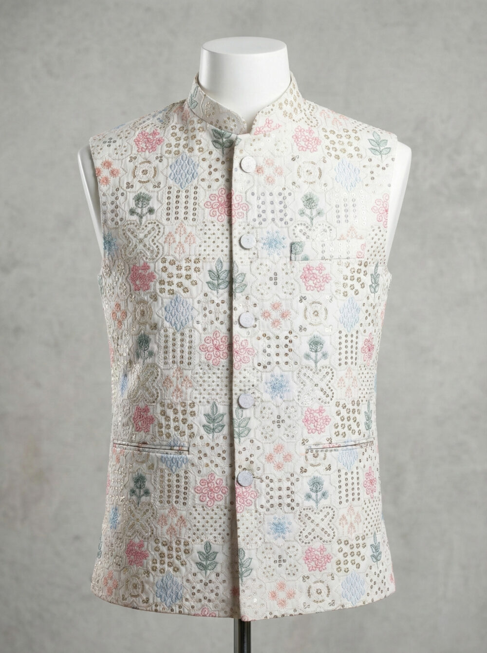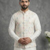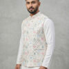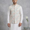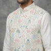Step into elegance with this White Embroidered Waistcoat from Its Moment. Crafted from premium Malai Satin, this Nehru jacket features exquisite all-over embroidery, making it a luxurious choice for weddings, receptions, and high-end parties.