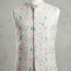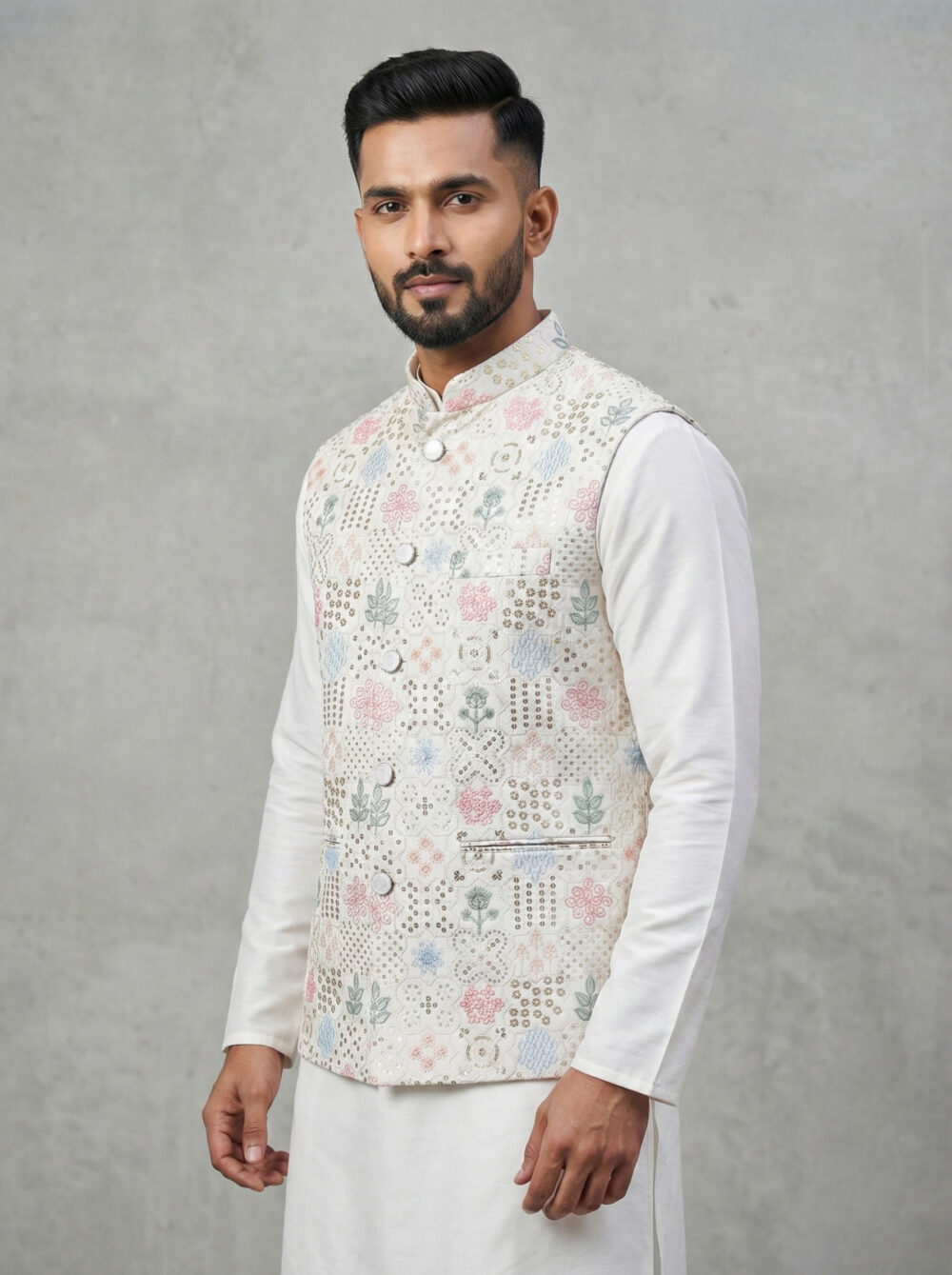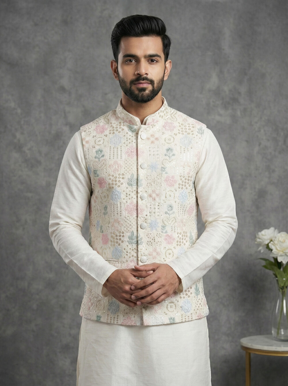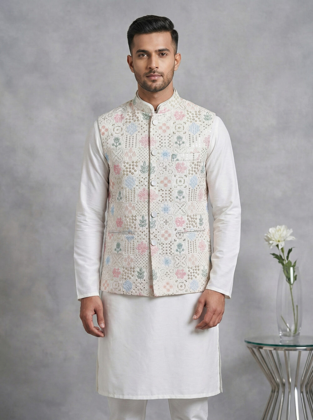 Step into elegance with this White Embroidered Waistcoat from Its Moment. Crafted from premium Malai Satin, this Nehru jacket features exquisite all-over embroidery, making it a luxurious choice for weddings, receptions, and high-end parties.