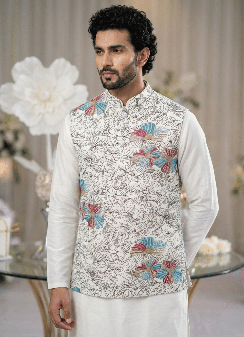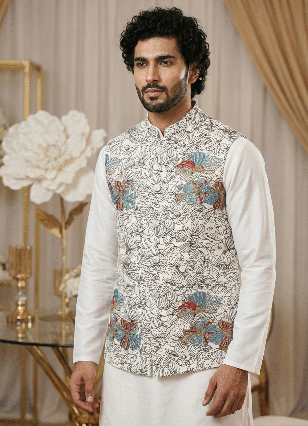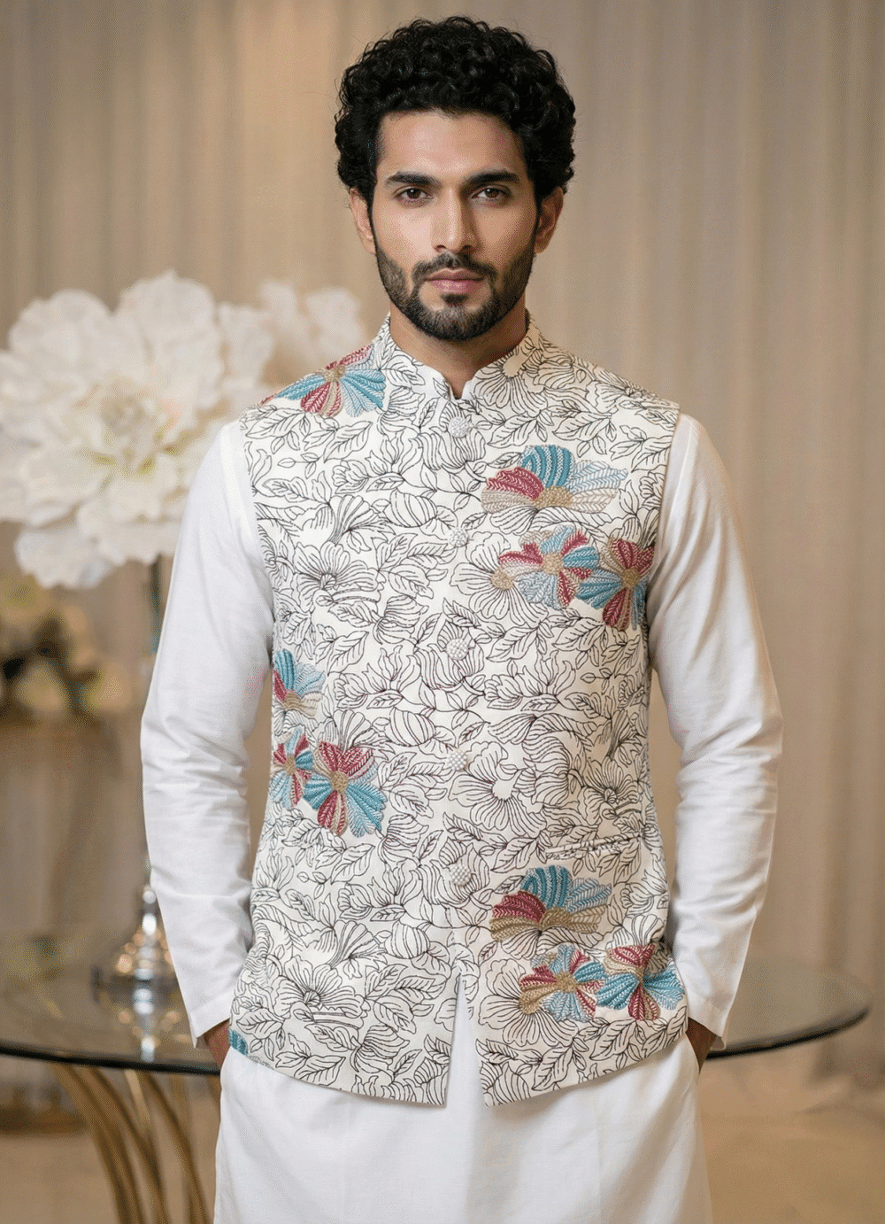 Made from premium Malai Satin, this Nehru jacket offers a subtle sheen and a luxurious hand-feel that standard fabrics cannot match. The coat features heavy all-over embroidery, adding a layer of sophistication and grandeur perfect for weddings, Sangeet functions, and festive gatherings.