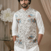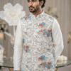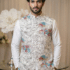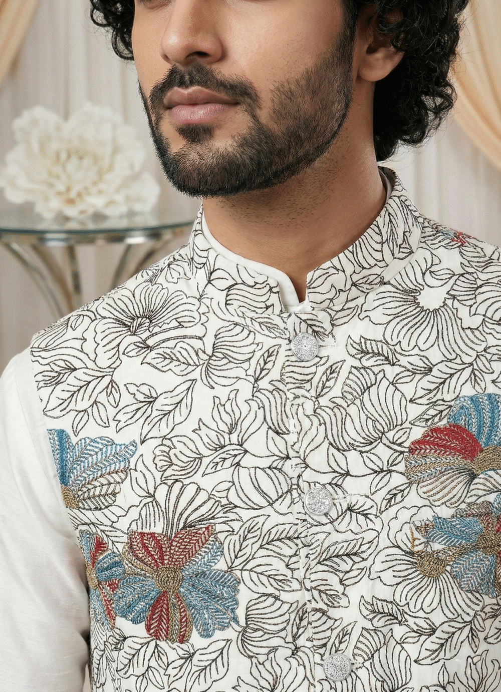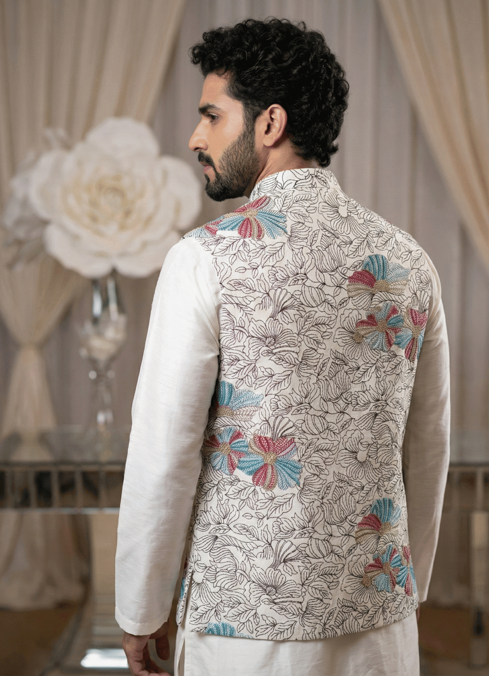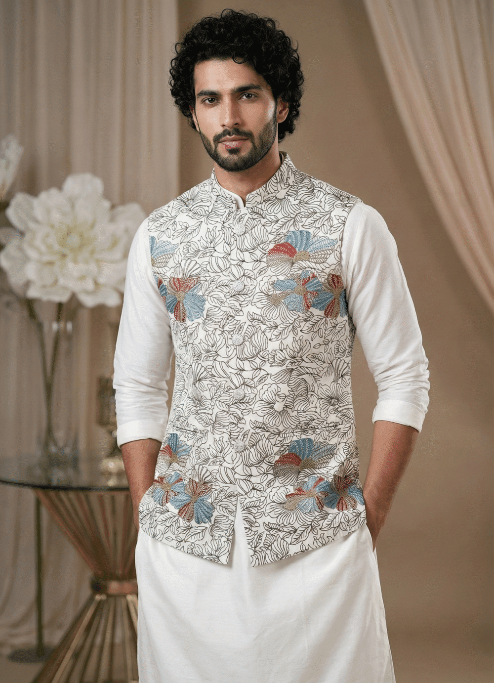 Made from premium Malai Satin, this Nehru jacket offers a subtle sheen and a luxurious hand-feel that standard fabrics cannot match. The coat features heavy all-over embroidery, adding a layer of sophistication and grandeur perfect for weddings, Sangeet functions, and festive gatherings.